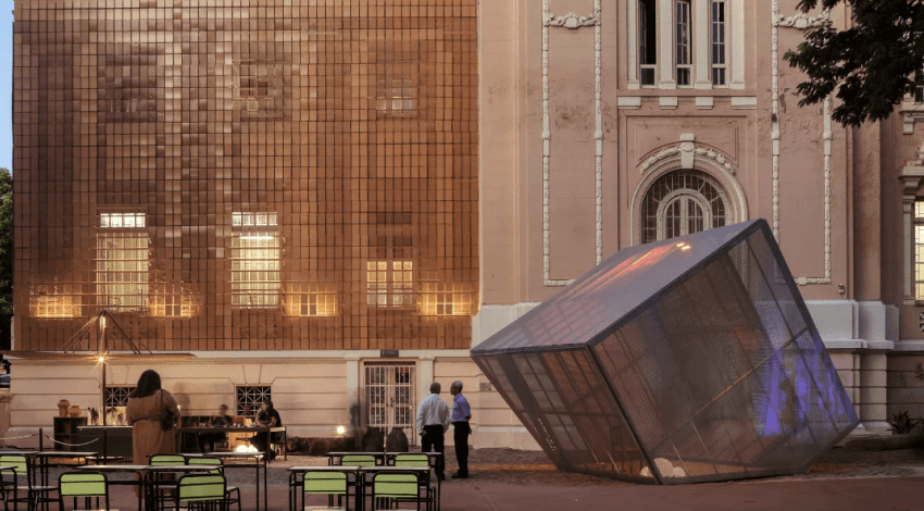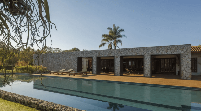 Arquitetura integra volumes e reflexos ao unir o rústico e o moderno em harmonia com a paisagem, equilibrando tradição e inovação por meio do contraste entre linhas retas e elementos coloniais preservados.