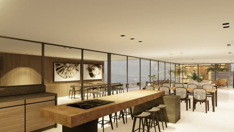 The interior architecture embraces a neutral approach, creating a backdrop that allows the blue of the sky and the lush green of the Vale do Sereno forest to be reflected throughout the ambient.