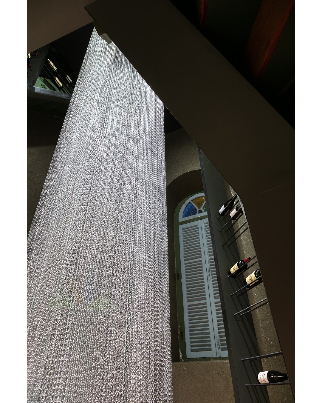 Upon entering, the eye is drawn to the interactive tubular metal sculpture, both imposing and inviting, stretching from ceiling to floor at the heart of the room, guiding visitors toward the cellar as it winds its way to the sinuous staircase. As one moves through the space, each phase of the wine ritual is revealed: the careful selection of the label, meticulous preparation, and, finally, the act of tasting—culminating in the encounter with a provocative artistic installation that inspires reflection.