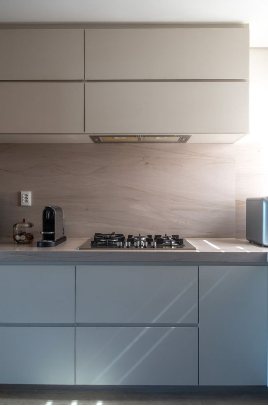 A calma dos tons beges e naturais do Travertino complementado com o leve calor da madeira clara, criou uma atmosfera de um calmo e elegante refúgio para se desconectar da acelerada vida na cidade e rotina dos clientes.