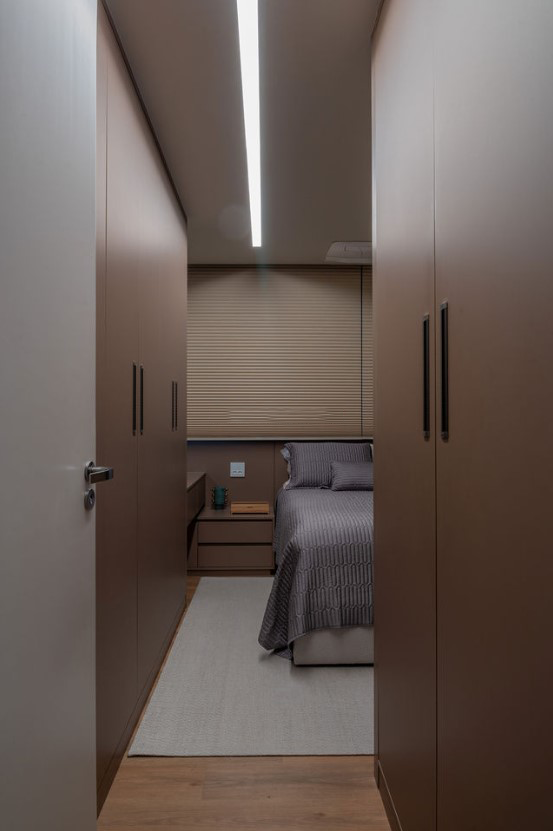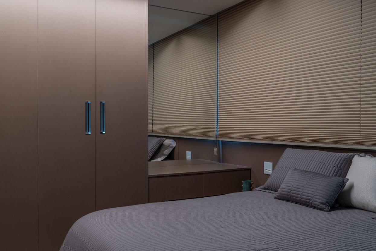 Detalhes na marmoraria tal como rasgo diagonal iluminando poltrona de leitura e sobreposições no painel de TV evidenciam a riqueza dos detalhes mesmo dentro de uma paleta minimalista.