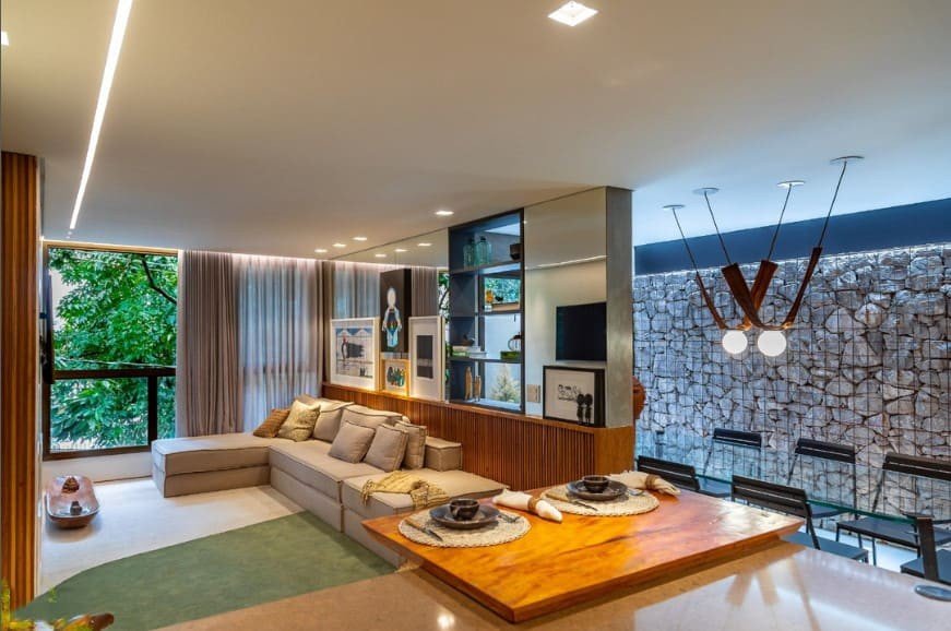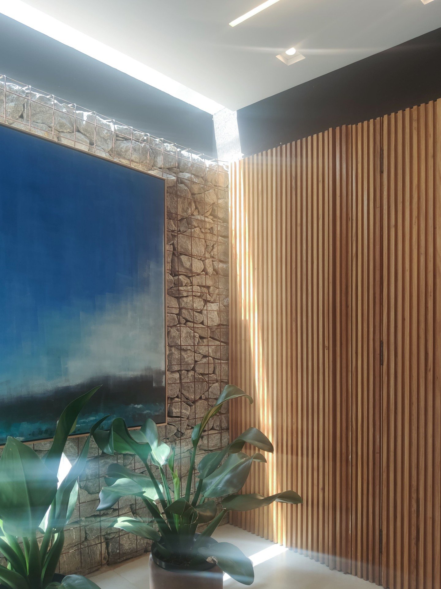 Neste projeto, concreto, madeira e pedra de gabião harmonizam-se com contraste e autenticidade.