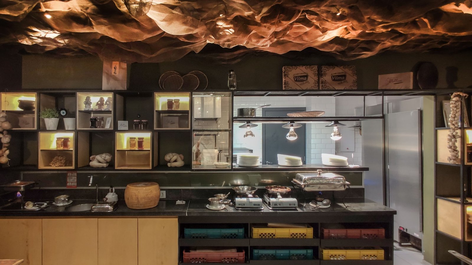 O desafio da arquitetura foi potencializar as características e habilidades louváveis deste renomado Buffet, sendo assim, foi pensada para que os pratos fossem feitos no show (ao vivo para o cliente), demonstrando toda a customização e domínio da gastronomia e dos processos de um atendimento de excelência.